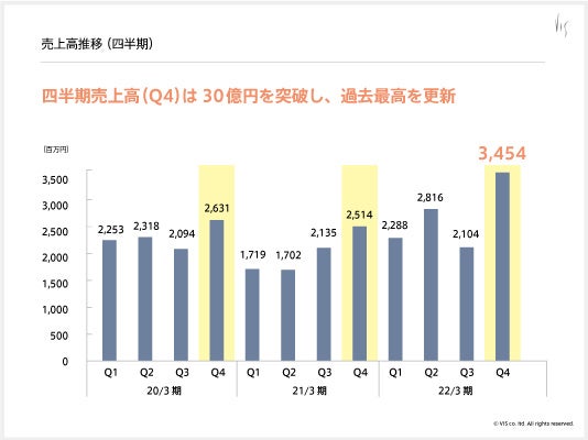 四半期売上高(Q4)は30億円を突破し、過去最高を更新しました。