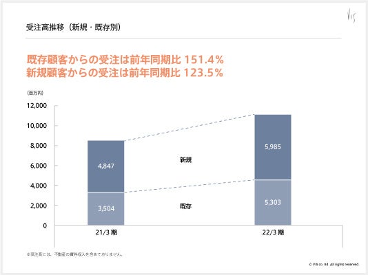 既存顧客からの受注は前年同期比151.4%、新規顧客からの受注は前年同期比123.5%と増加しました。