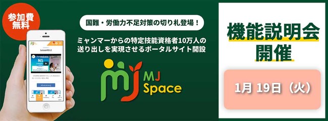 スマホで日本語と特定技能の技能試験対策が無料で学べる『MJ Space』機能説明セミナーを2021年1月19日(火)に開催。アジア最貧国ミャンマー全国民5,500万人に、夢と希望に満ちた人生を!