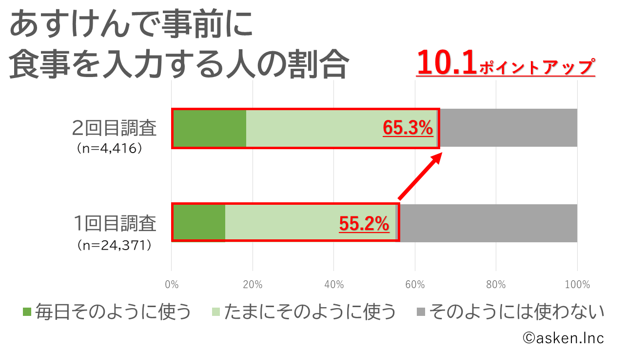 当社が行ったユーザー調査の中で、「あすけんに、食べようとしている食事を事前に入力することで、これから食べるものを決めることがあるか」という質問に対し、「毎日そのように使う」「たまにそのように使う」と回答したユーザーの割合が、2020年の調査では55.2%でしたが、2022年の調査では65.3%に増加していました。