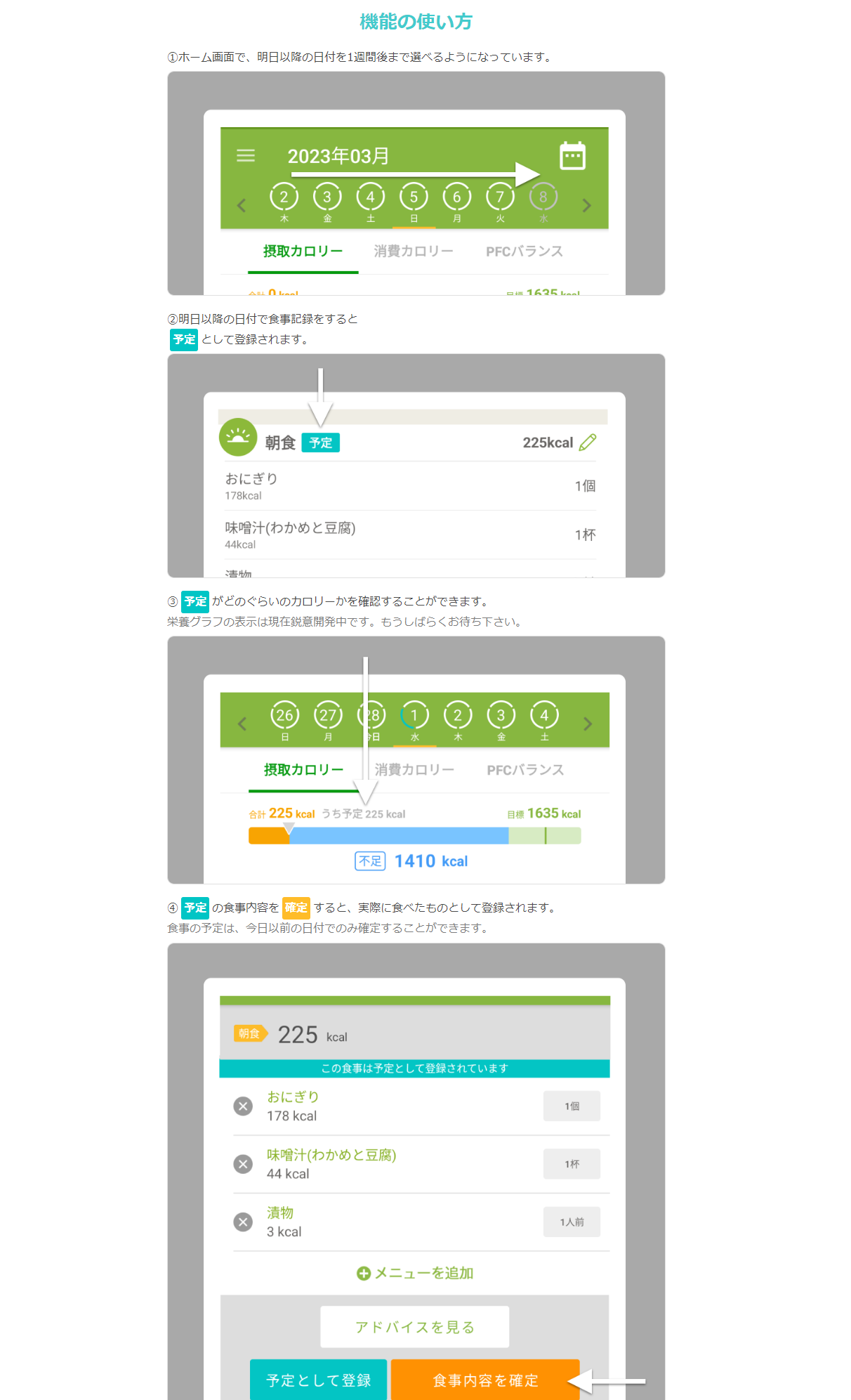 ・食事予定入力機能の使い方:https://www.asken.jp/info/lp/app/information/plan202304/