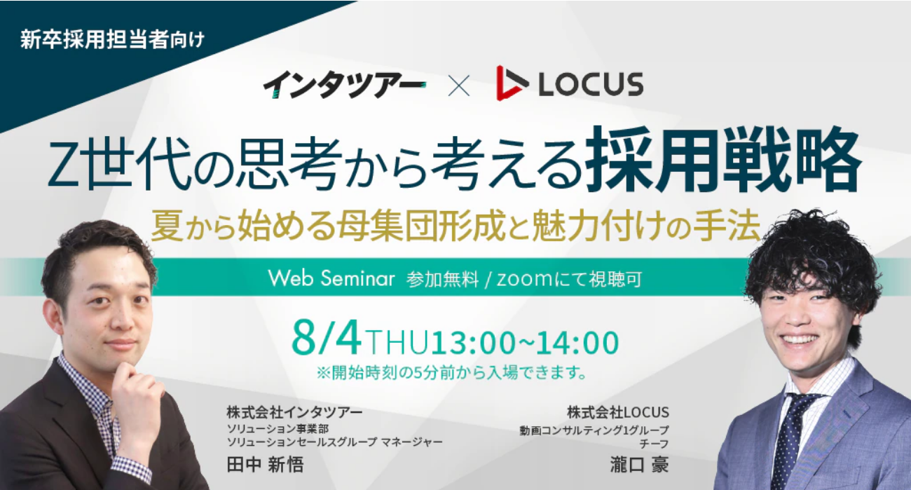 当セミナーでは、採用マーケティングプラットフォームを提供する株式会社インタツアーと、10年以上の採用動画制作実績を持つ株式会社LOCUSが共催で「今、企業に求められる効果的な採用手法」と「Z世代就活生に対する効果的な魅力付け動画」について2部構成で解説いたします。