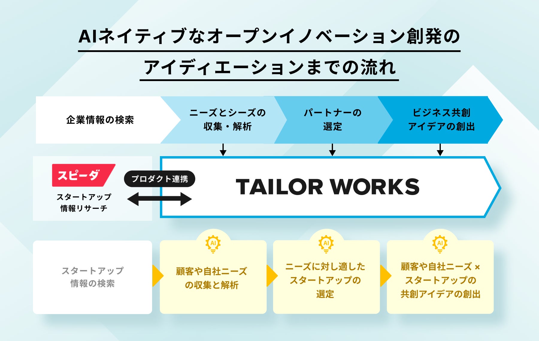▼スピーダ スタートアップ情報リサーチ×TAILOR WORKSが実現するAIネイティブなオープンイノベーション創発のフロー