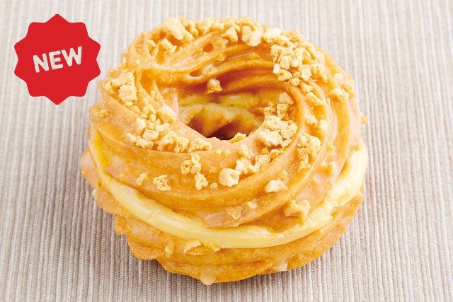 ふんわり軽い食感のフレンチクルーラーで甘くて濃厚なキャラメルクリームをサンド。仕上げにキャラメルグレーズをコーティングし、サクサクのアーモンドクランチをトッピング。