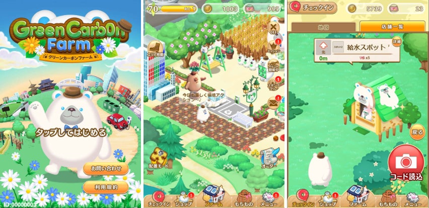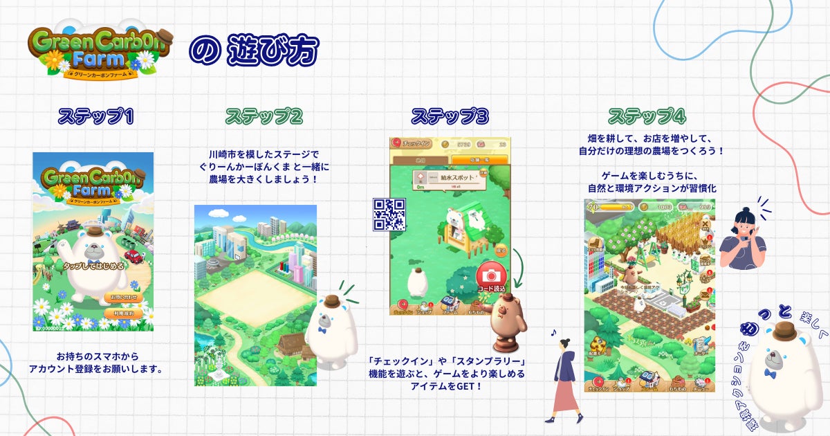 『 Green Carb0n Farm 』は、実際の川崎市を模したフィールドが特徴の箱庭シミュレーションゲームです。登場する白くまのキャラクター「ぐりーんかーぼんくま」と一緒に農場を発展させながら、自分だけの農場づくりを楽しめます。