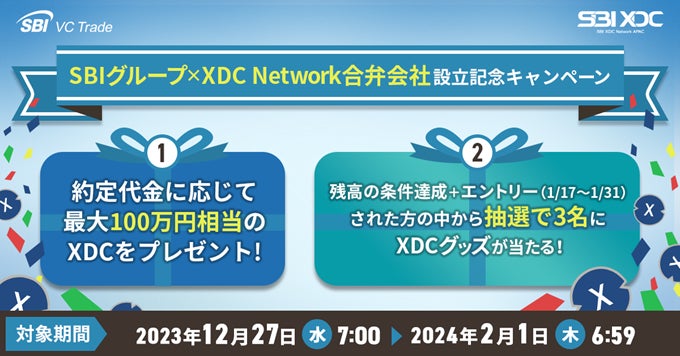 SBI VCトレード株式会社(本社:東京都港区、代表取締役社長:近藤 智彦、以下「当社」)は、2023年12月27日(水)より、「SBIグループ×XDC Network合弁会社設立記念キャンペーン~最大100万円相当のXDCプレゼント、抽選でXDCグッズも当たる~」を実施することをお知らせいたします。