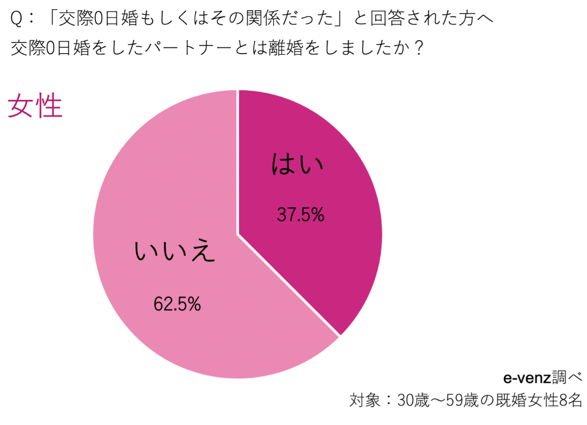 交際が0日ということもあり、お互いのことを結婚してから知ることとなるため、性格の不一致、価値観の違いなどが離婚の原因となる場合があるのではないでしょうか。