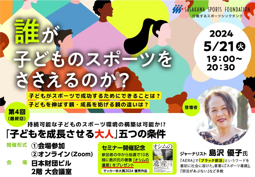 最終回となる第4回は、『スポーツ毒親』、『部活があぶない』など、スポーツや教育関係をフィールドに多くの著書を手掛ける島沢 優子氏(ジャーナリスト)をお招きします。子どもがスポーツで成長するために、親が持つべきマインドセット、子どもを伸ばす親・成長を妨げる親の違いは何か。など5つのポイントの根拠と実例を詳しくお話しいただきます。