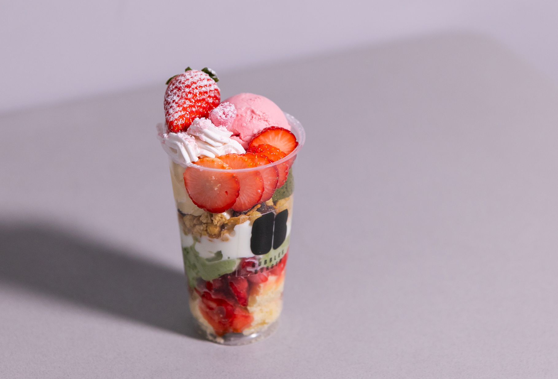 「苺・桜・抹茶」が一度に楽しめる、見た目にも春を感じる季節限定パフェです。あまおうアイス、苺ソース、抹茶ブラウニー、抹茶パンナコッタ、バニラアイス、生クリーム、スポンジケーキ、桜フレーク、桜の花と、階層毎に違った味をお楽しみ頂けます。