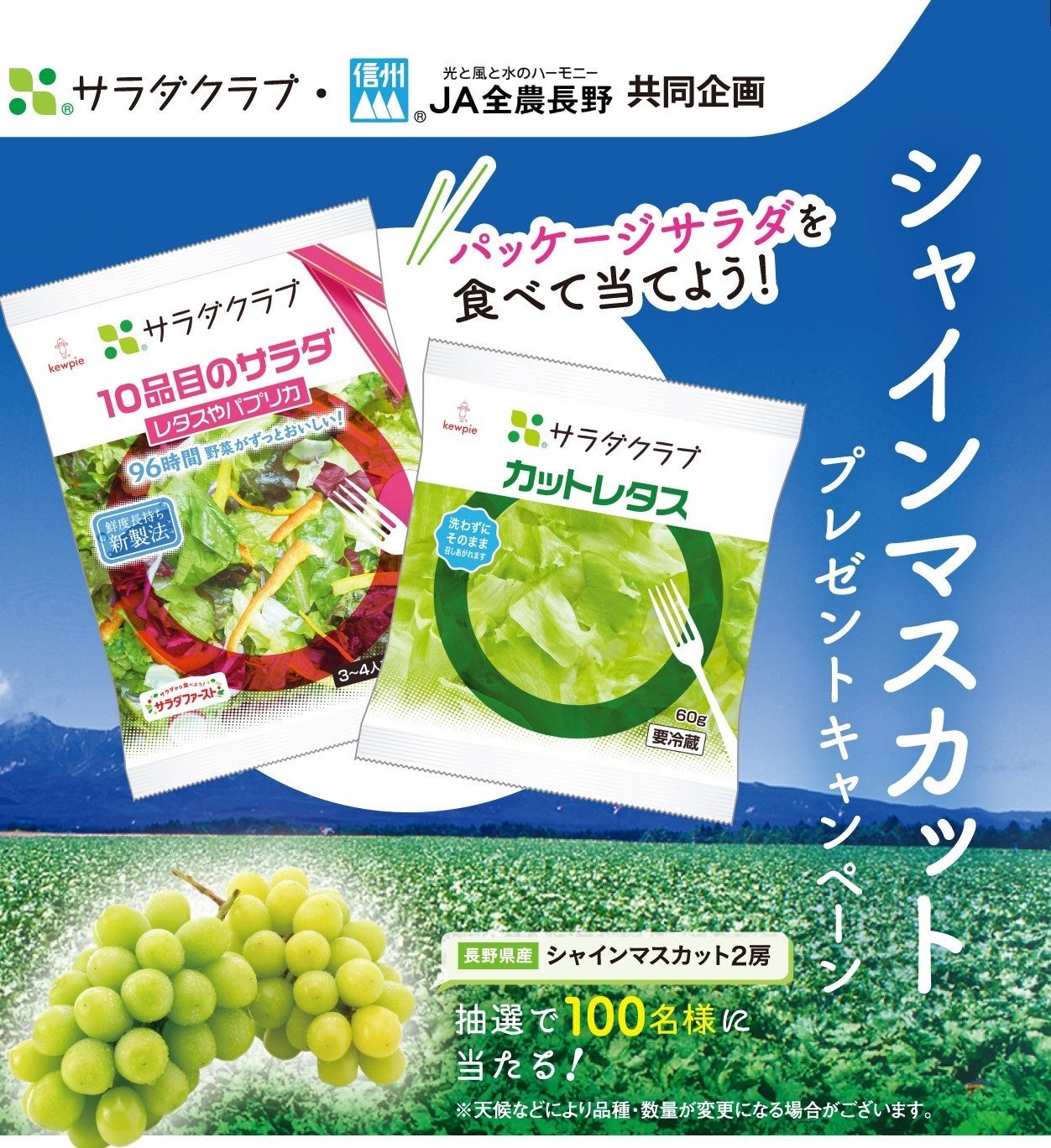 「JA全農長野(全国農業協同組合連合会 長野県本部)」と共同でプレゼントキャンペーンを実施します。2023年6月14日(水)から7月14日(金)の期間、対象商品についているバーコードを集めてご応募いただくと、長野県産「シャインマスカット」2 房が抽選で100名様に当たります。詳細はキャンペーンサイトをご確認ください。