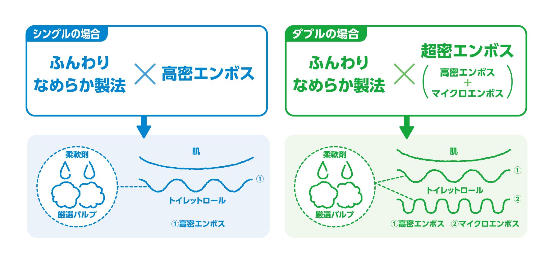 紙そのものの厚みを増したことに加え、柔らかいパルプの比率がアップしました。さらに独自のエンボス加工を継続採用し、高密度なエンボス加工を施すことで、やわらかくなめらかな肌ざわりを実現しました。従来のエンボスの特長をよりわかりやすくお伝するべく、シングルでは「高密エンボス」、ダブルでは「超密エンボス」(裏面に施した細かなマイクロエンボスと表面の「高密エンボス」の組み合わせ)として、パッケージに表記いたします。