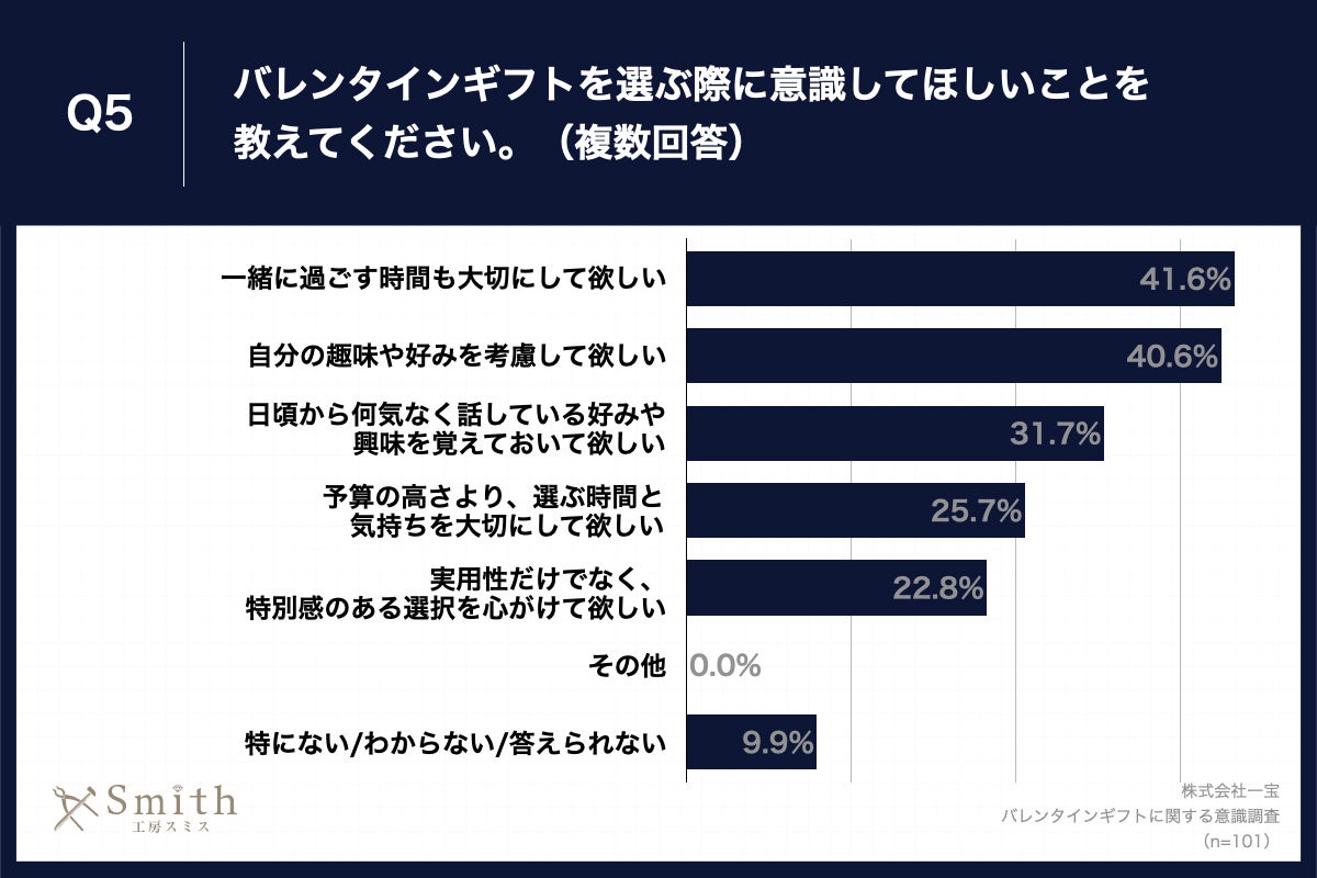 「Q5.バレンタインギフトを選ぶ際に意識してほしいことを教えてください。(複数回答)」(n=101)と質問したところ、「一緒に過ごす時間も大切にして欲しい」が41.6%、「自分の趣味や好みを考慮して欲しい」が40.6%、「日頃から何気なく話している好みや興味を覚えておいて欲しい」が31.7%という回答となりました。