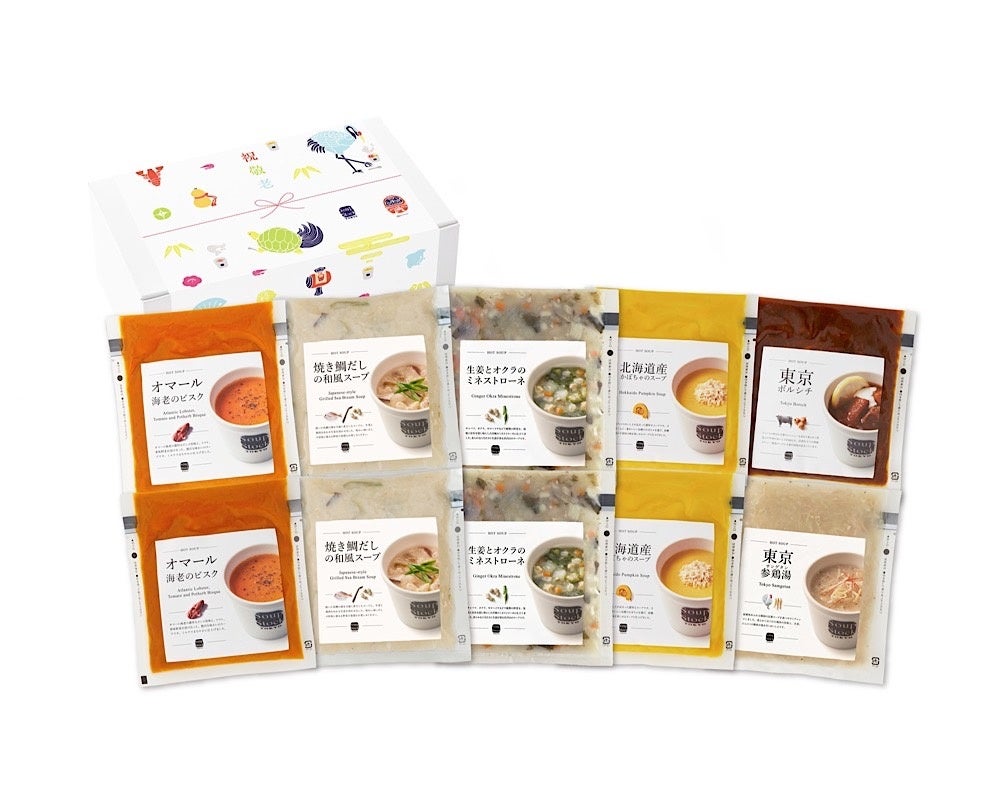 今回のギフトには、定番の「オマール海老のビスク」や「東京ボルシチ」を始め、「焼き鯛だしの和風スープ」や「東京参鶏湯」など、体をいたわれるようなスープを選びました。