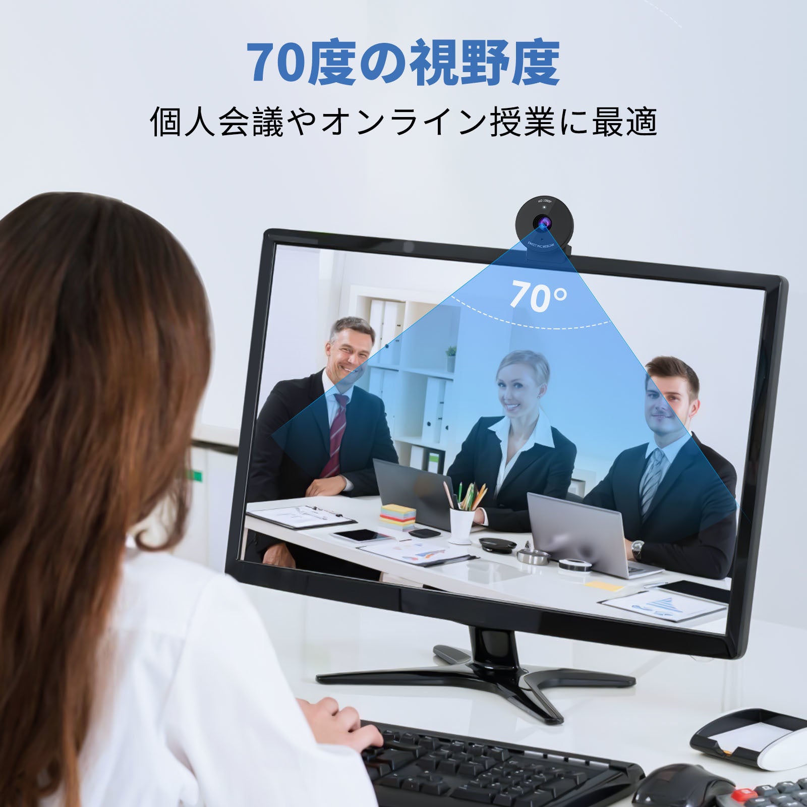 固定フォーカスレンズを搭載しており、ブレ等を解消してストレスのない映像記録が可能。70度の視野度により幅広い範囲をカバーできるため、個人会議やオンライン授業にも最適です。