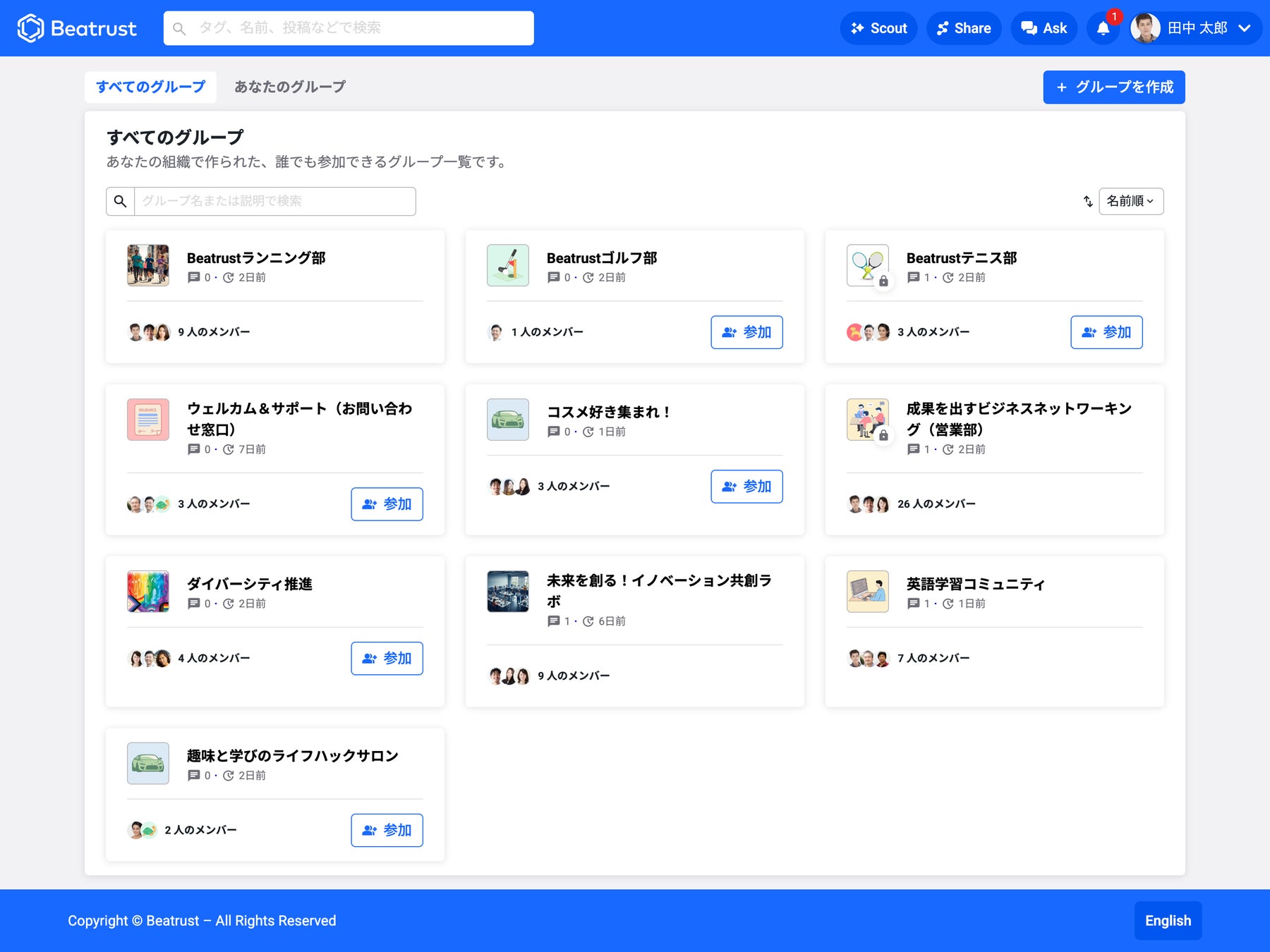 「Beatrust Groups(グループ)」は、社内のコラボレーションをより多層的・自発的に促進するための新機能です。Beatrustのタレントコラボレーションツールに新たに加わり、特定のテーマやトピックに基づいて自由にグループを作成*し、知識共有やプロジェクト共創の拠点となる空間を提供します。(*オープン制や管理者等によるメンバーの追加、管理者のみがグループの作成可能など詳細な設定も可能です。)