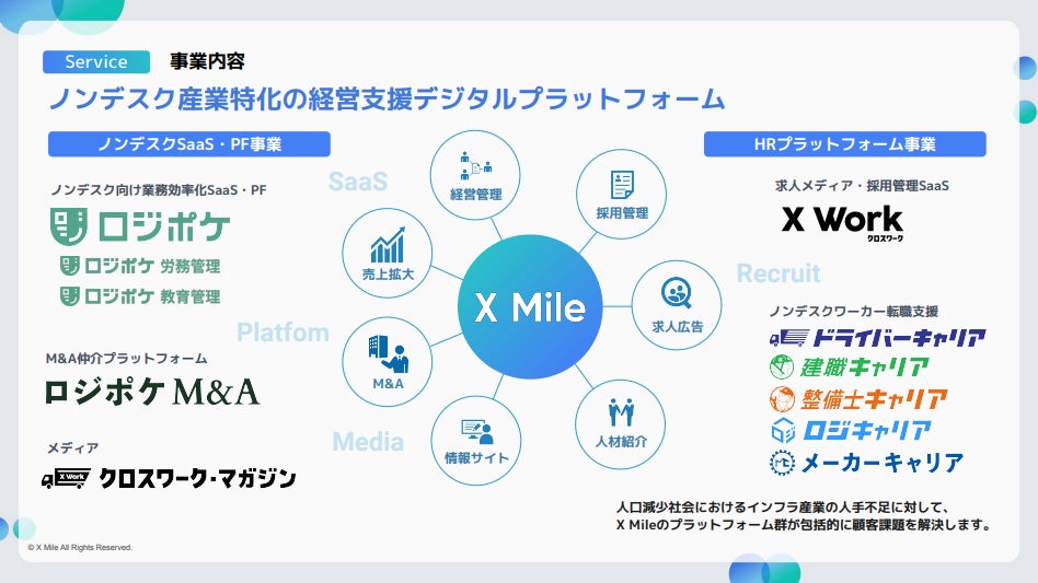 物流、建設、製造といった産業は衣食住を支える社会生活におけるインフラであり、決して止まることができない産業です。そうした事実にも関わらず、ノンデスクワーカーの社会的地位は低く、業界の問題や活躍に光が当てられていないのが現実です。このような背景から、その貢献に対して注目を浴びてこなかったノンデスクワーカーが多く従事する、「ノンデスク産業」に焦点を定めて、人手不足の解消やデジタル化を進めるべく旗揚げしたのがX Mileです。