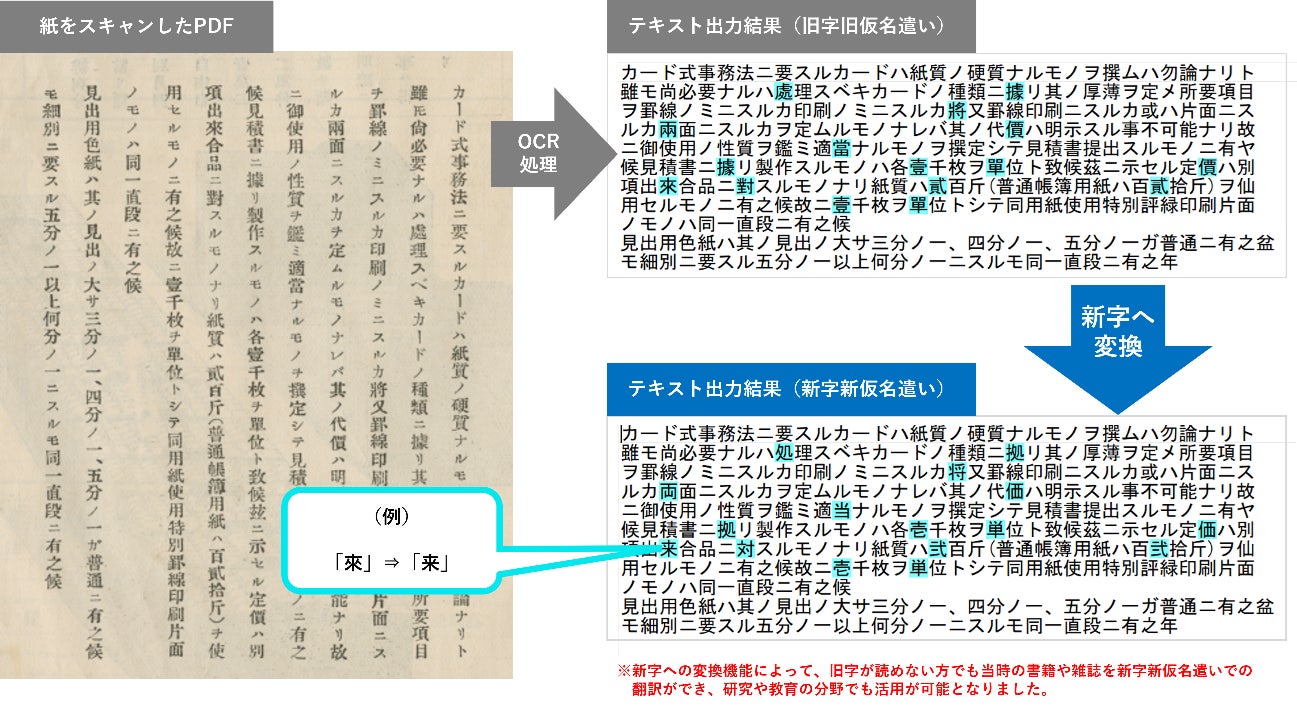 例えば、透明テキスト付PDFで新字新仮名文字を重ね合わせることで、過去の歴史的資料の検索性が圧倒的に高まると考えております。