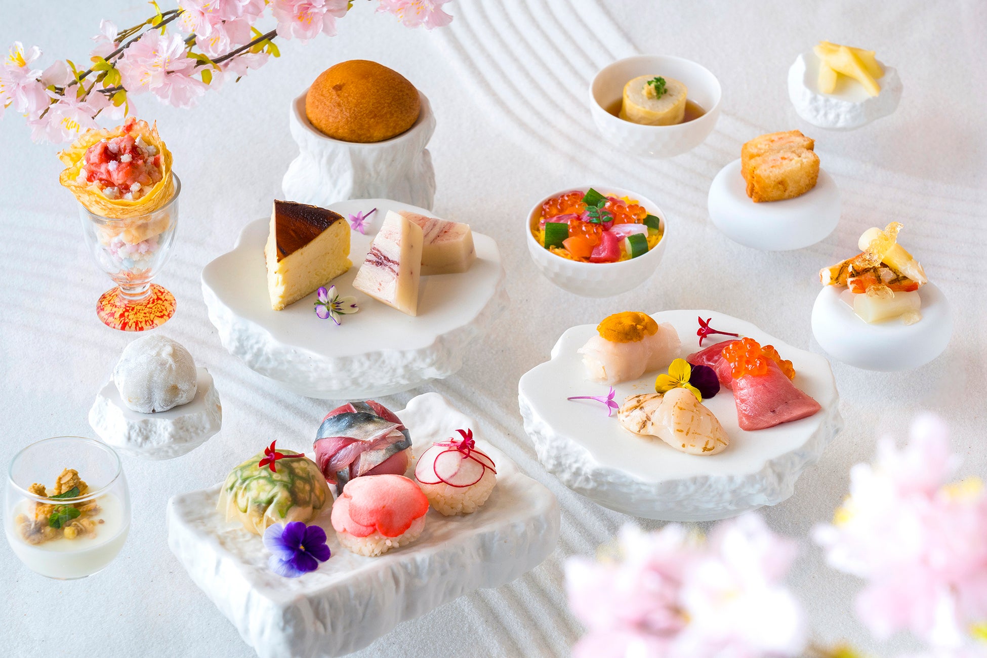 残冬の候、新たな季節へ胸が躍る時期にお届けするアフタヌーンティー風ランチ「花蓮」では、新年や新生活の幕開けに相応しい、海老や昆布など縁起の良いと言い伝えられている食材と河豚(フグ)や蟹、トロを含む高級食材を使用した心躍る期間限定メニューをご用意致します。前菜3種、ミニちらし寿司、握り寿司3種、手毬寿司4種、ともづな特製ミニクレープを含むスイーツ5種、選べる和菓子が美しいプレゼンテーションとともに楽しめる贅沢なランチです。