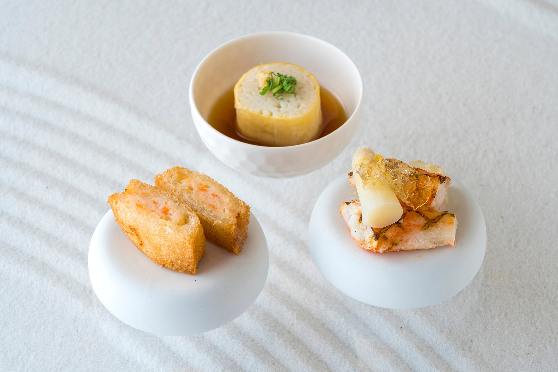 前菜の「焼きタラバガニ」では、タラバガニの弾力のある食感と旨味を楽しんで頂くため丁寧に火入れをし焼きました。タラバガニ1肩目は、ホワイトアスパラガスを甘酢に漬けたともづなオリジナル和風ピクルスとともに堪能し、2肩目は、土佐酢を使用したジュレで味変をお楽しみください。前菜2品目に寿司割烹 ともづな料理長 萩原和隆の出身地長崎県の郷土料理「ハトシ」をご用意致しました。明治時代に清国(現在の中国)から長崎に伝わった海老のすり身で創った餡を食パンで挟み揚げた料理です。ともづなでは、海老のすり身と海老のたたき、新玉ねぎを混ぜ合わせた特製の餡を食パンで挟みカリっとするまで揚げました。すり身とたたきを両方用いる事でプリプリとした食感をより一層感じる事ができる料理長のこだわりと郷土愛が詰まった一品です。前菜3品目「うどん湯葉巻き」は、五島うどんを丁寧に湯葉で巻き温かい出汁が心身を温めます。