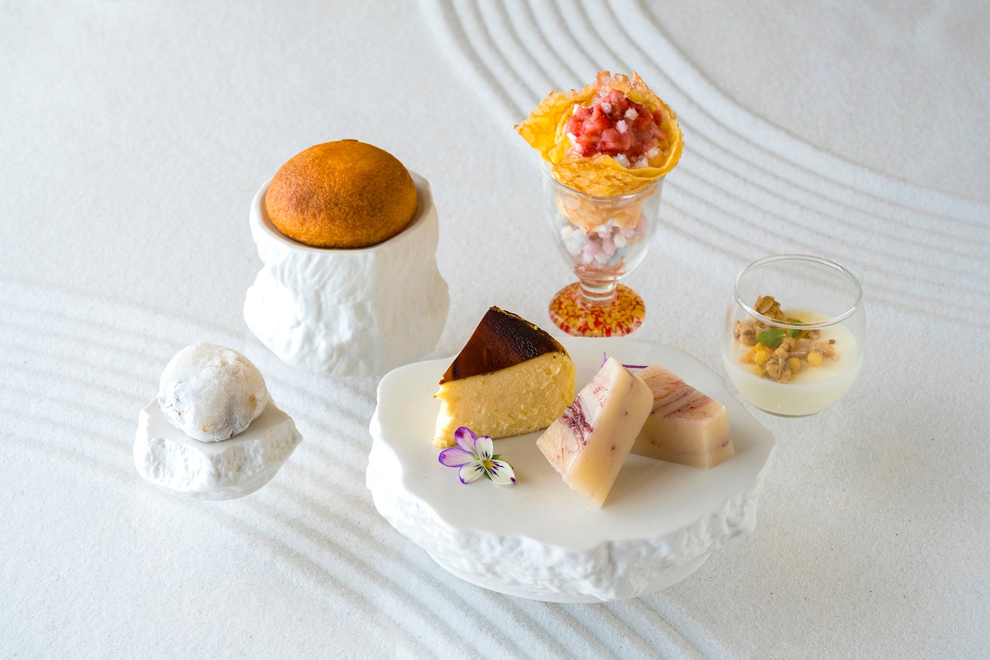 デザートは、フレッシュ苺と後味にほんのりあられの風味を感じる金平糖を使用し和風にアレンジした「ミニクレープ」、クラッシュナッツやクッキーをあしらった「レモンムースのヴェリーネ」、「バスクチーズケーキ」、マーブル模様が特徴的な「ベリーの羊羹」、芋餡と小豆餡を使用した「二十層大福」に加えて、お好きな季節の和菓子をおひとつお選びいただけます。