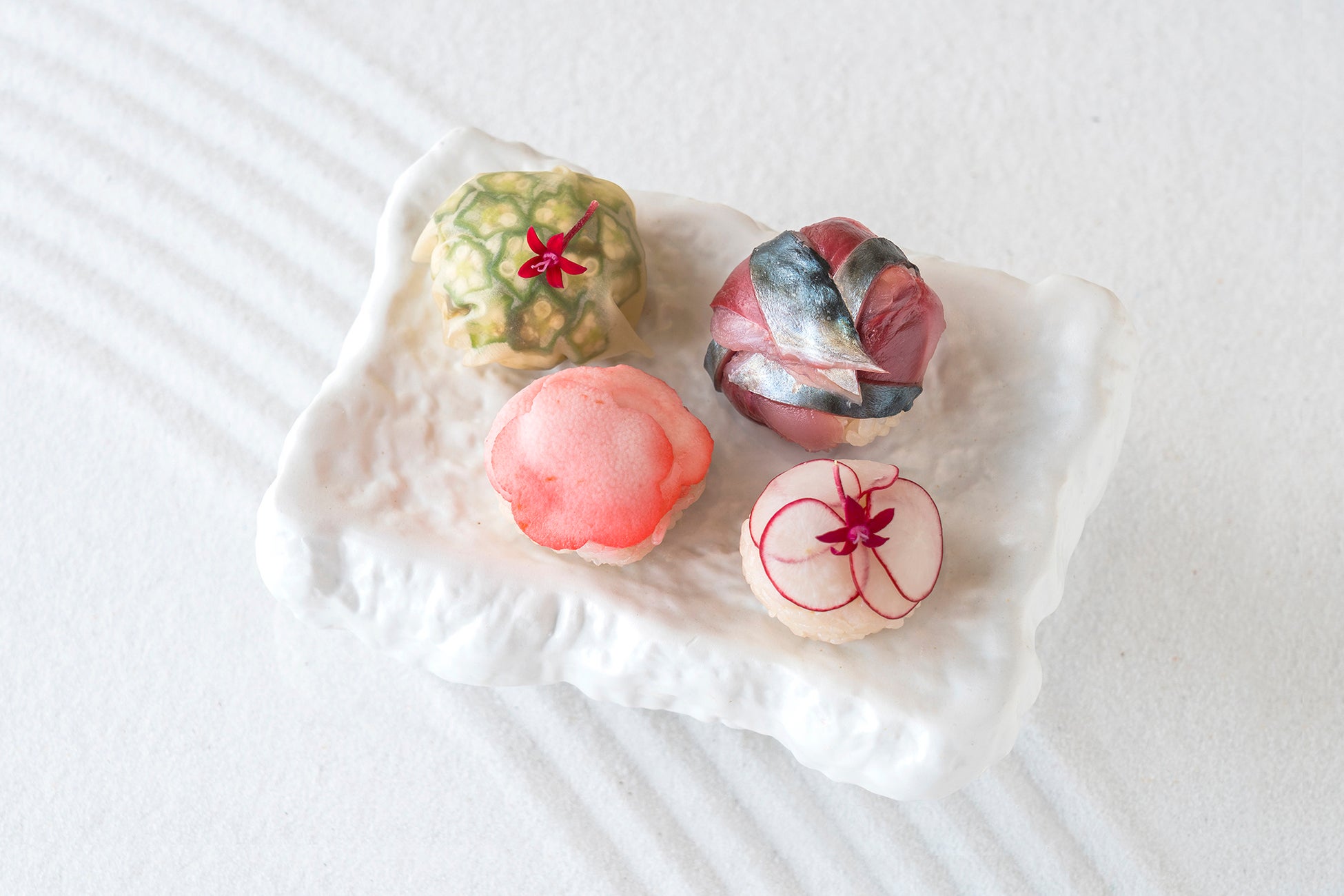 握り寿司3種は、薄く引いた河豚に雲丹を贅沢にあしらった「河豚・雲丹寿司」。扇を開いたような見た目から縁起の良い貝と言い伝えられている帆立を昆布締めにした後、香りを際立たせるため炙った「帆立昆布締め握り」、トロの上からイクラをふんだんにかけた「トロいくらかけ」をご用意致します。春を彩る花々をイメージした手毬寿司も4種ご賞味ください。裏ごしした梅で山芋を赤く染め、梅の花の形に象った「香梅山芋」は山芋にしっかりと染みた梅の風味を感じる一貫。その他にも、昆布の塩味とオクラのトロトロとした食感が楽しめる「おぼろ昆布巻き」、奈良県の吉野葛でとろみをつけた塩味香るともづな特製の出汁を塗った「重ねラディッシュ」、「鯖寿司」をご用意致します。