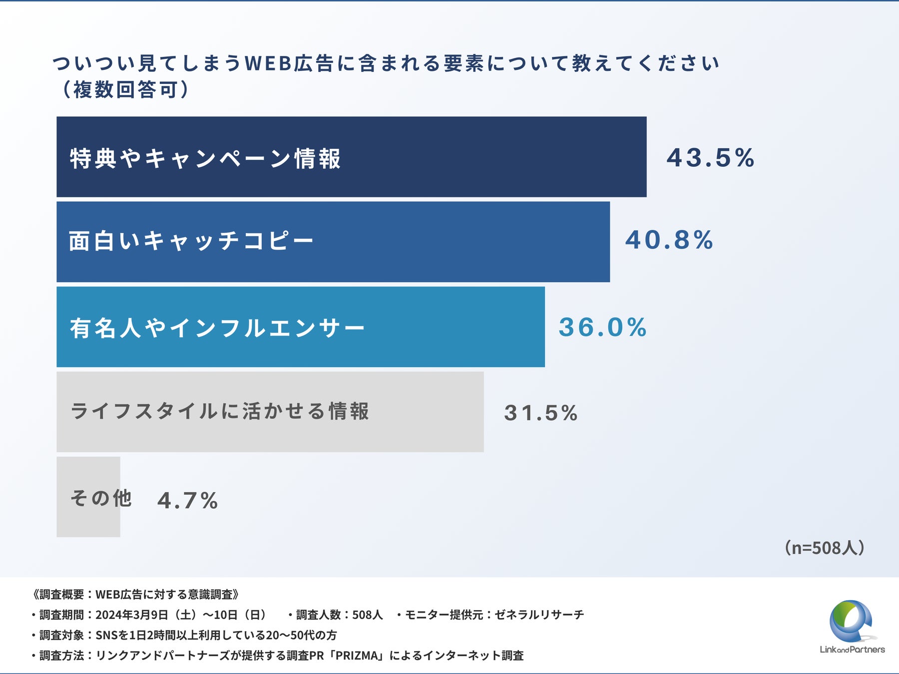 今回、株式会社リンクアンドパートナーズは、SNSを1日2時間以上利用している20〜50代の方を対象に「WEB広告に対する意識調査」を実施しました。