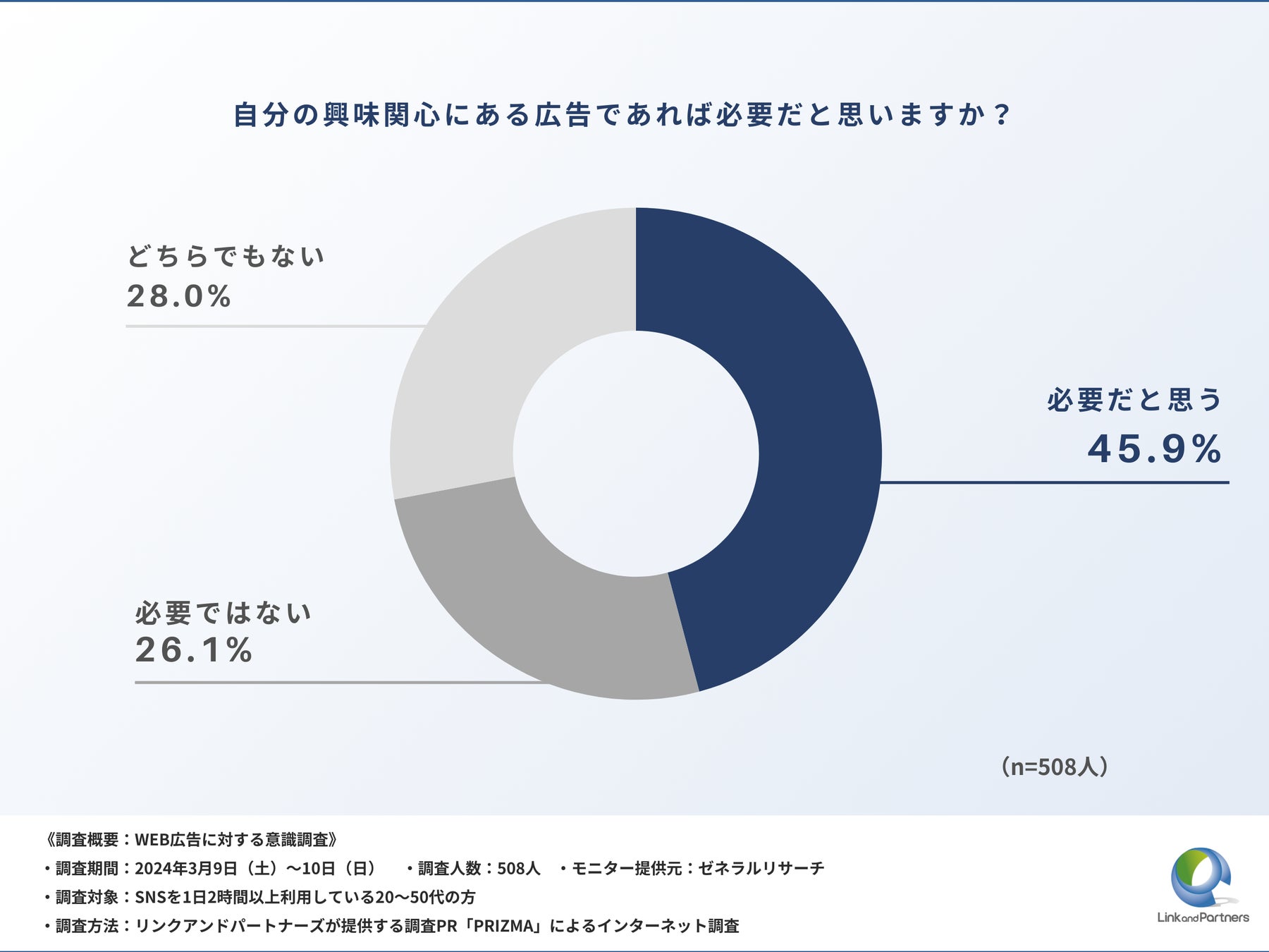 「Q9:自分の興味関心にある広告であれば必要だと思いますか?」では、「必要だと思う」が45.9%、「必要ではない」が26.1%、「どちらでもない」が28.0%という回答になりました。
