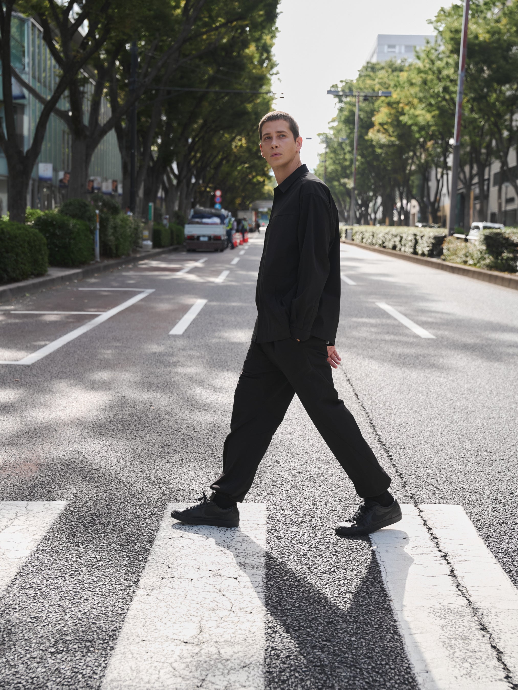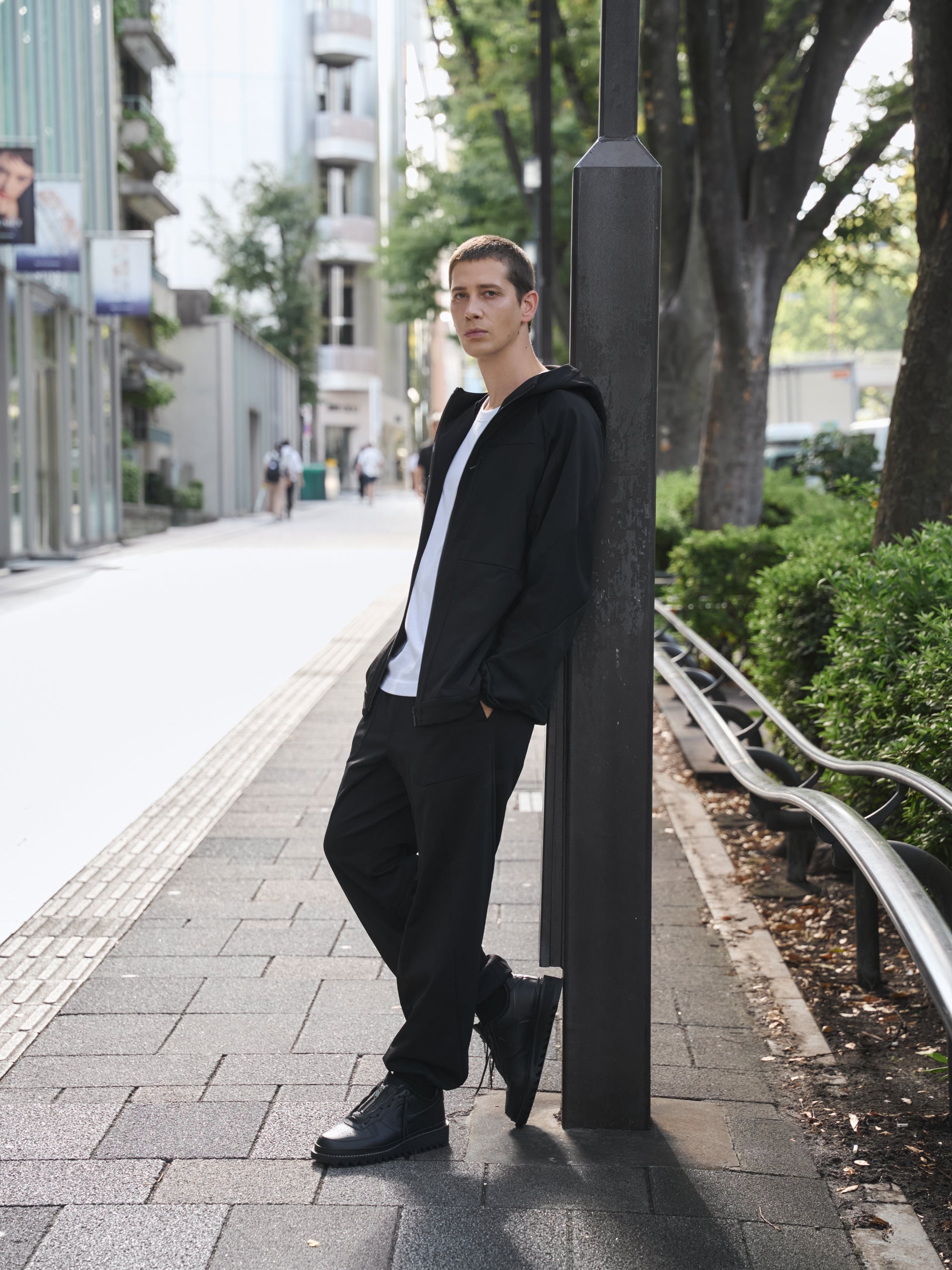今回のTHE TOKYO別注では、毎シーズン定番だった布帛とジャージのコンビをあえて外し、初めて裏毛素材を取り入れた4アイテムが登場します。共通して、White Mountaineering特有のテクニカルなパターンを活かして縫製できるよう、ソフトシェルと裏毛の中間のような生地を採用しています。
