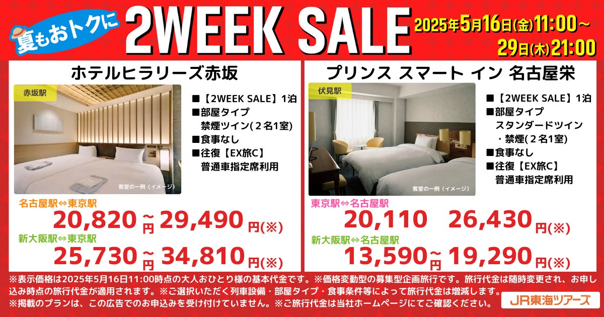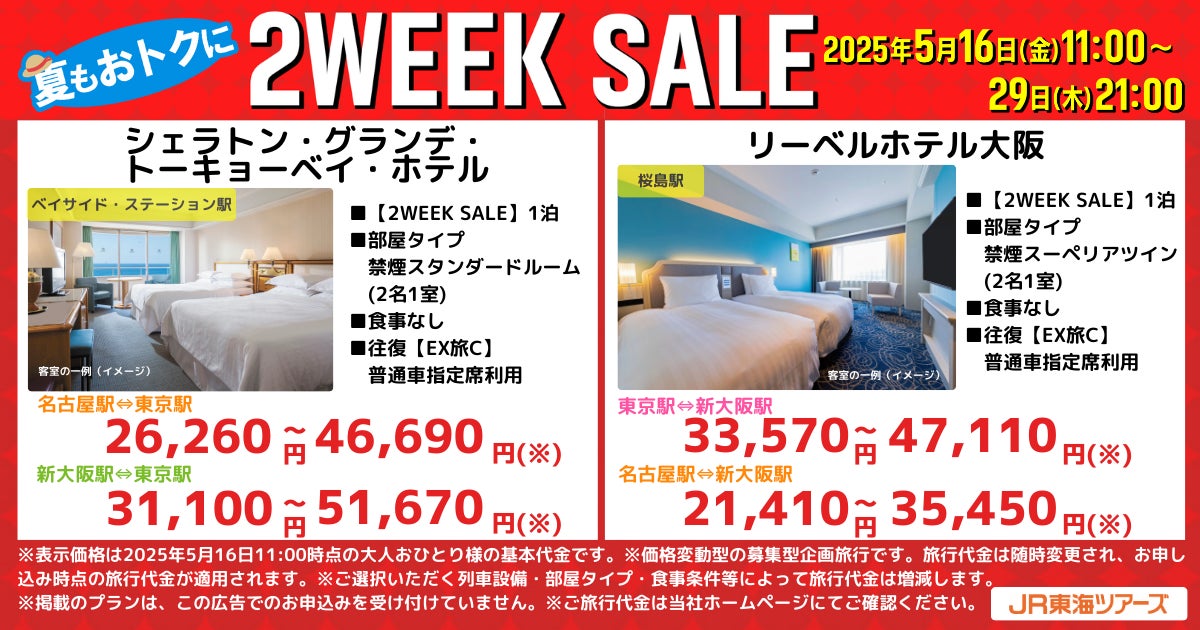 株式会社ジェイアール東海ツアーズ(本社:東京都中央区、以下JR東海ツアーズ)は、2025年5月16日(金)11時から5月29日(木)21時まで「2 WEEK SALE」を開催しています。また、セールと同時に名古屋地区と静岡地区でテレビCMを放映いたします。今回のセールは、2025年6月15日(日)から9月30日(火)出発の夏の旅行が対象です。セール対象施設数は合計215施設に拡大し、さらにお盆期間も特別価格となります。新幹線と宿泊がセットでお得なEX旅パックが、14日間限定でさらに値下げしセール価格で登場します。このチャンスをお見逃しなく!