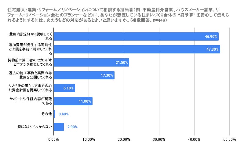 ●81.8%が「見積もり増額に不安を感じる」と回答。費用が増えるとわかった場合、46.6%が「計画を延期・中断」、19.7%が「施工/仲介会社を変更」と回答し、費用の不透明さがユーザー行動を大きく阻害する実態が浮き彫りに。