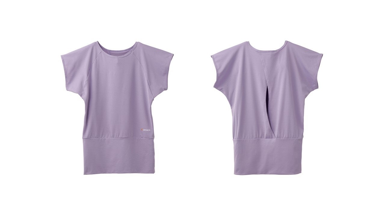 腕を上げ下げしやすいよう袖丈はラグランスリーブ、背中側はあらゆる動きに対応できるバックオープンデザインにしました。ウエスト部分にはほど良くホールド感を持たせ、前屈の動きや、体を伸ばす動きをしても、めくれ上がりづらい構造にしており、ウエスト周りもスッキリと引き締まります。