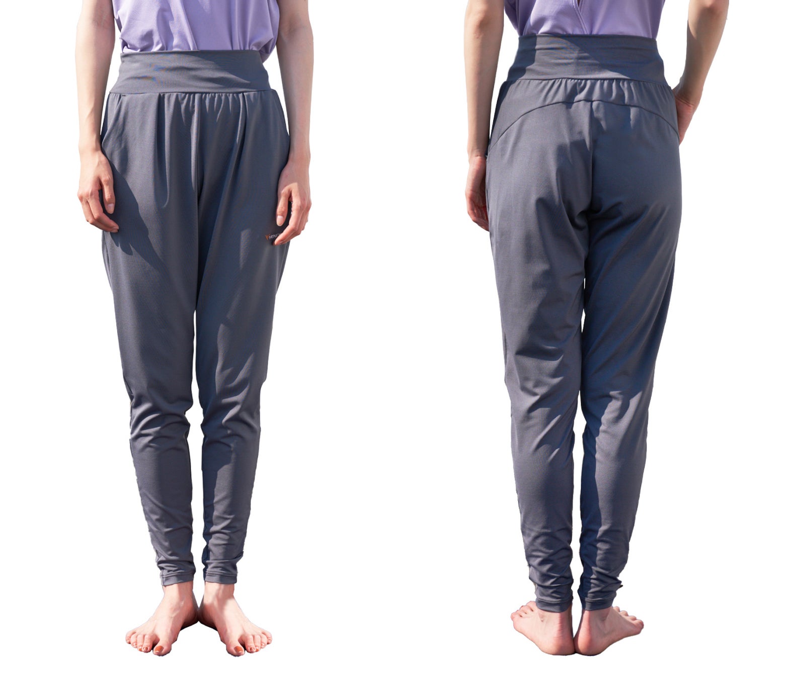 ウエスト部分のベルト幅は広く腰回りをしっかりホールドし、“ズレ”のストレスを軽減しています。8分丈で裾口はすぼまったシルエットになっているため、足を上へ上げたり曲げ伸ばしたりしても、めくれ上がりにくくしました。
