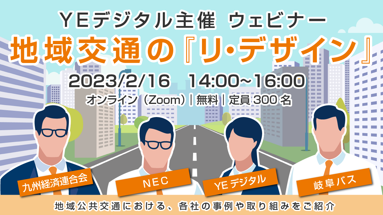 デジタルを活用したまちづくりを促進する株式会社YE DIGITAL(本社:北九州市小倉北区 代表取締役社長:玉井裕治 以下、YEデジタル)は、この度”エネルギー・医療・教育” さまざまな分野と共に持続可能な地域交通を創り出すウェビナー「地域交通の『リ・デザイン』」を2023年2月16日(木)にオンラインで開催いたします。