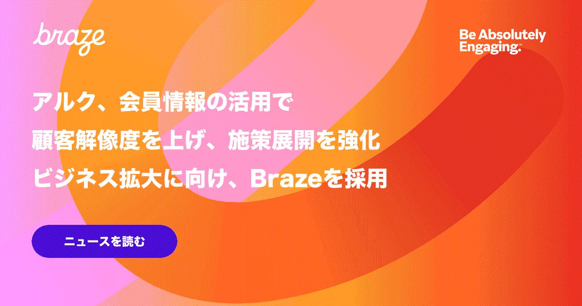Braze は、ブランドが「Be Absolutely Engaging」を実現するカスタマーエンゲージメントプラットフォームです。Braze の活用で、マーケティング担当者はあらゆるデータソースから、データを収集、施策実行ができ、1 つのプラットフォームからマルチチャネル、かつリアルタイムに、顧客とパーソナライズされたコミュニケーションができます。さらにAIで仮説検証と最適化を繰り返しながら、大量配信を支援するスケーラビリティーで、ハイパーパーソナライゼーションを実現し、ブランドに熱狂するファンとの魅力的な関係を構築、維持できます。同社は、2024 年の米国ニュースで働きがいのあるテクノロジー企業に選ばれ、英国の Great Place to Work 誌で 2023 年の女性にとって最も働きやすい職場に選ばれ、ガートナー の 2023 年マジック クアドラント でマルチチャネル マーケティング ハブおよびマーケティング ハブのリーダーに選ばれました。 The Forrester Wave: クロスチャネル マーケティング ハブ、2023 年第 1 四半期。Braze はニューヨークに本社を置き、北米、ヨーロッパ、APAC に 10 以上のオフィスを構えています。詳細については、https://www.braze.co.jp をご覧ください。