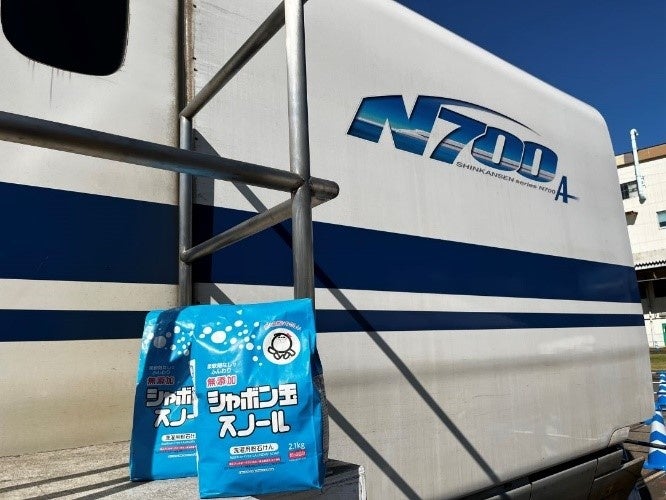 山陽新幹線全線開業50周年記念の博多総合車両所公開イベントでシャボン玉石けんの無添加「粉石けんスノール」による新幹線車体洗浄体験を実施