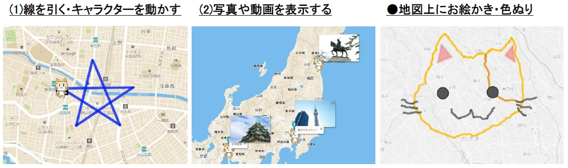 ブロックを組み合わせてプログラミングを行うことで「(1)線を引く・キャラクターを動かす」、「(2)写真や動画を表示する」などの表現を、地図上で行うことができます。また、「線を引く」や「色ぬりを表示」機能を組み合わせることで、地図上に絵を描くことも可能です。