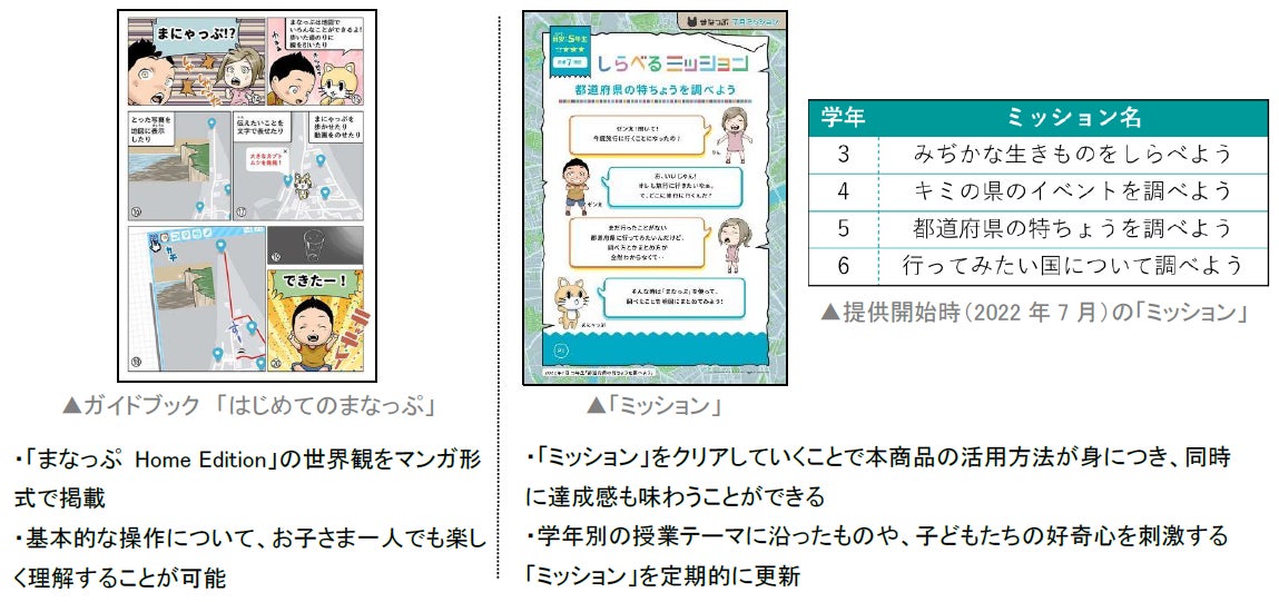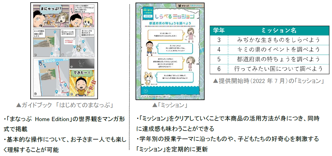 本商品は、Webブラウザ型サービスの「プログラミング教材」と合わせて、操作方法などを記載したマンガ形式のガイドブック「はじめてのまなっぷ」、子どもたちの自発的な学習を支援する「ミッション」をセットで提供します。