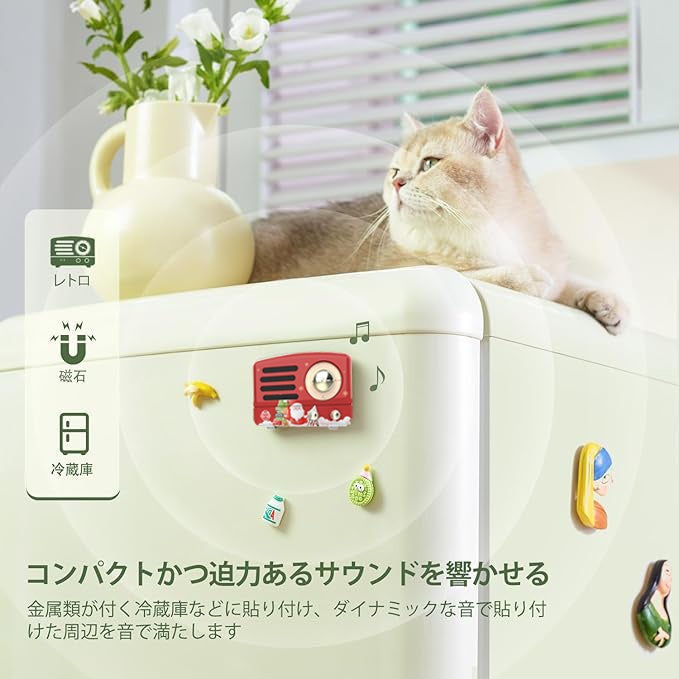 冷蔵庫だけでなく、インテリアとしても室内環境に馴染みやすく、楽しい逸品です。例えば、金属製の食事棚に貼られた場合、棚の表面がスピーカーの演奏に共鳴し、MUZEN PETAスピーカー本体の質量を超えたダイナミックな音量・低音を表現します。
