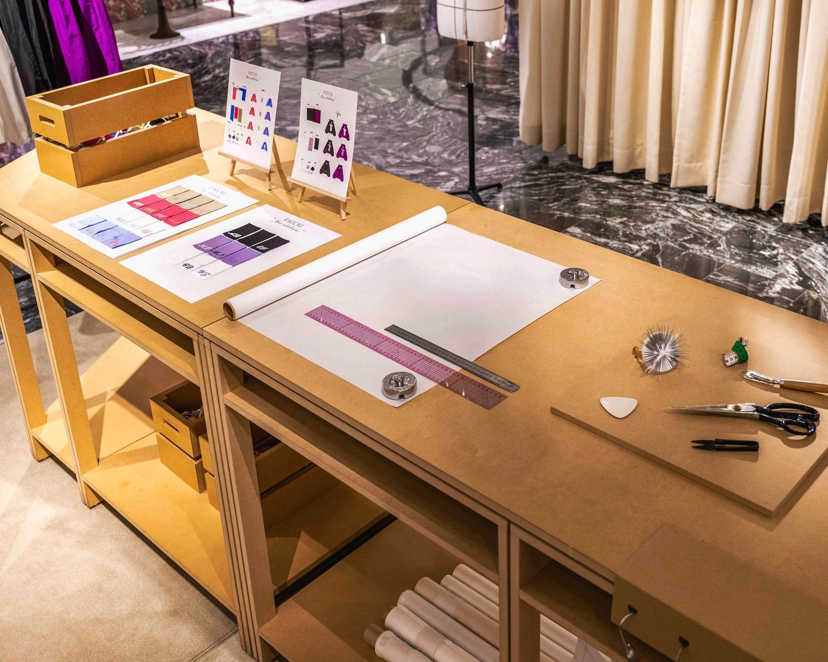 ポップアップスペースは、パトゥがパリ・シテ島に構えるアトリエの雰囲気をイメージした空間を演出しております。この機会に特別なクチュール体験をぜひご体験ください。