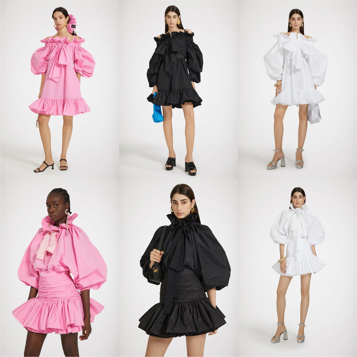 しなやかなリサイクルポリエステルのタフタを使用したシリーズ。アイコニックなパトゥ ピンク、ブラック、ホワイトの3色のフリルスカートとドレスを展開いたします。