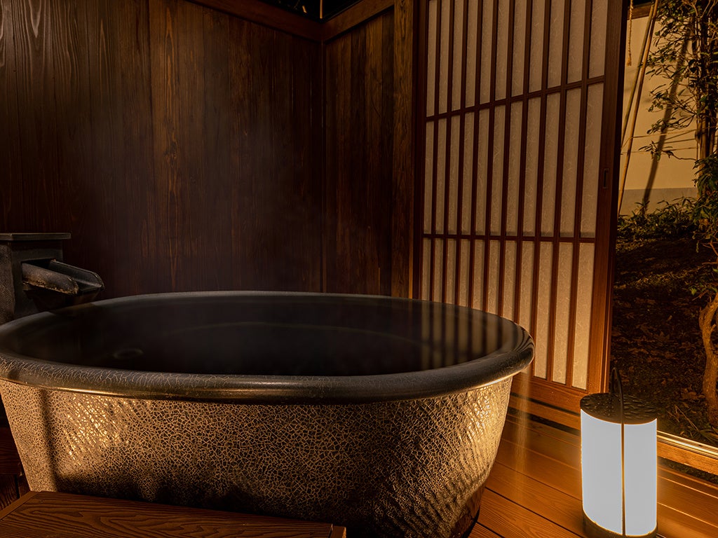 お部屋にあるプライベート露天風呂は、贅沢な源泉かけ流し。美人の湯・温まりの湯としても知られる「ナトリウム・カルシウム・塩化物・硫酸塩温泉」を心ゆくまでご堪能いただけます。