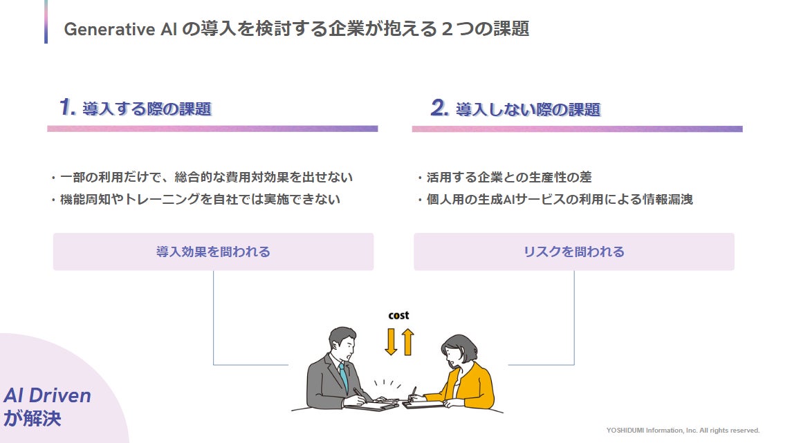 吉積情報は、これらの課題を解決し、企業が安全かつ効果的に生成 AI を導入できるよう、「AI Driven」を提供します。