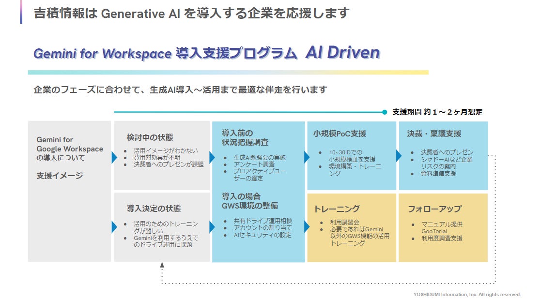 吉積情報株式会社(本社:東京都千代田区、代表取締役社長:秋田晴通、以下、吉積情報)は、Google Cloud が提供する生成 AI サービス「Gemini for Workspace」の導入支援プログラム「AI Driven」の提供を開始します。