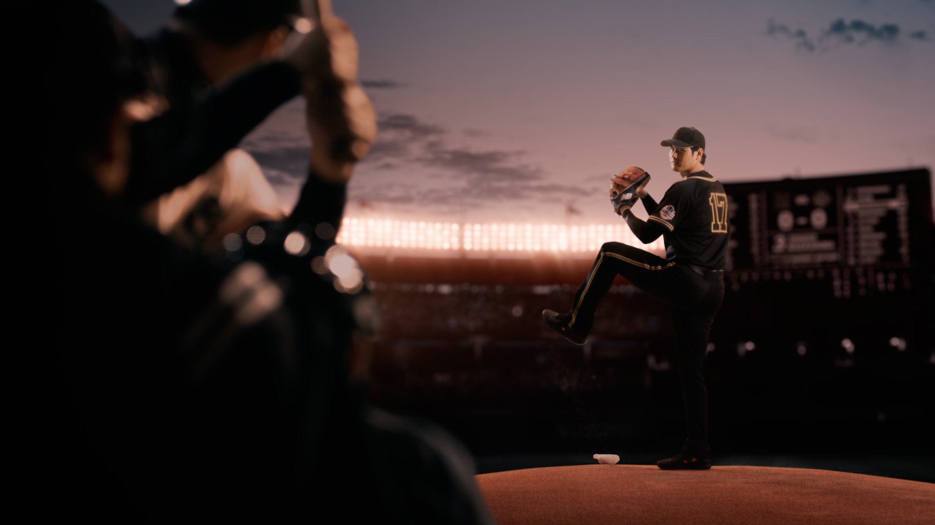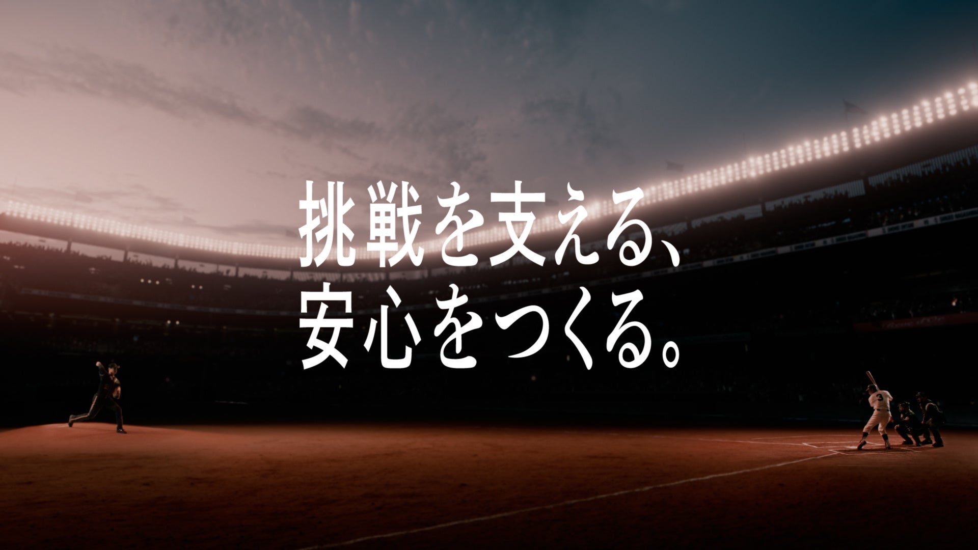 「60年前、ひとりの日本人にアメリカから実は声がかかっていた」。大谷さんのナレーションとともに、大谷さんが見つめる先には背番号3番の文字。CGによって再現された当時の長嶋さんが、大谷さんの視線を打ち返すかのように静かな表情で見つめます。マウンドに立つ大谷さんとバッターボックスで構える長嶋さんの緊張感ある対峙に熱狂する観客も、静かに見守る観客もそれぞれの様子でモニターに注目します。「いま、ぼくはその場所で挑み続けています」のナレーションにあわせて放たれる大谷さんの投球には、かつてアメリカ行きの話があった長嶋さんに向けた未来からの挑戦と、日本球界の発展に寄与し続けたミスター・プロ野球への敬意が込められています。「挑戦を支える、安心をつくる。」というメッセージで、セコムが皆さんの挑戦を支え、安心できる環境をつくることを宣言するとともに、最後はお二人のナレーションによる「セコム、してますか?」で締めくくります。