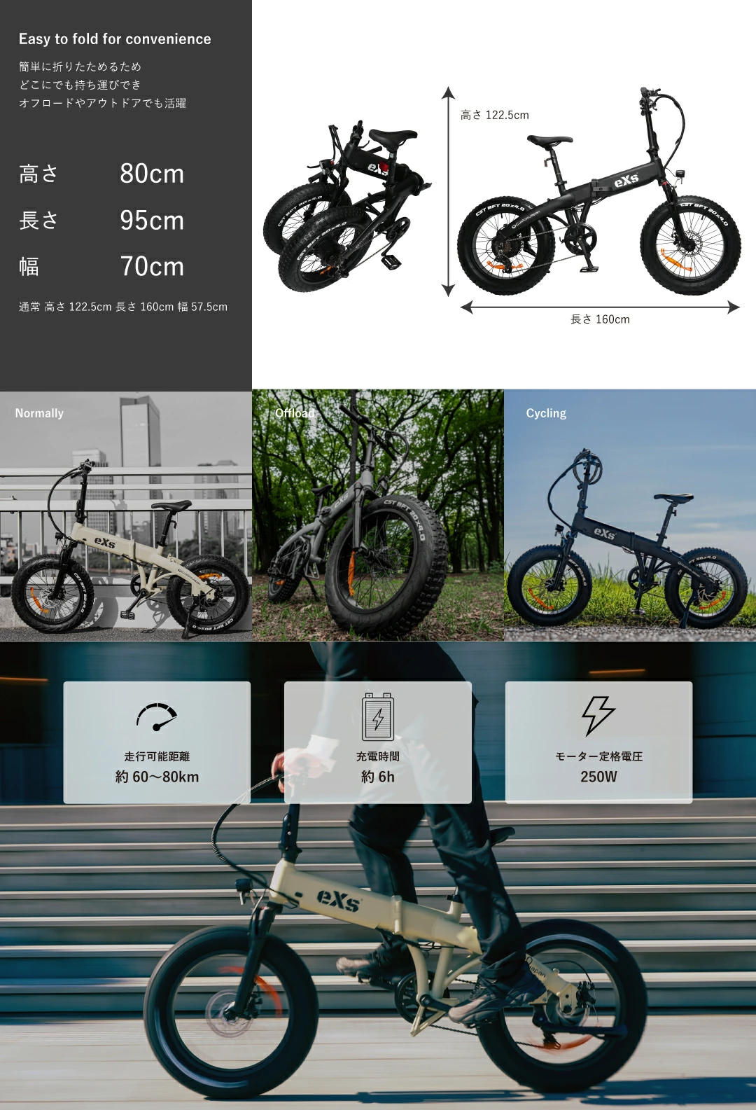 主な特徴:20×4インチファットタイヤ・走行可能距離約60-80km・空気入れ内蔵式サドルポスト
