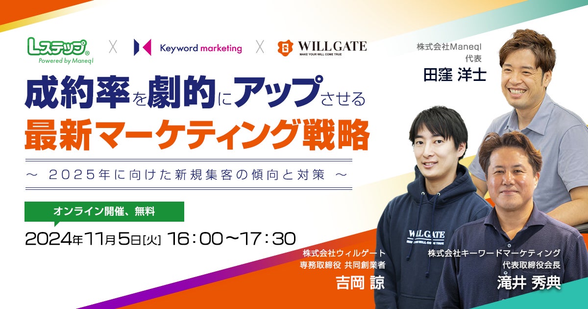 株式会社ベクトル(本社:東京都港区、代表取締役会長兼社長:西江 肇司、東証プライム:6058)の子会社である株式会社キーワードマーケティング(本社:東京都港区、代表取締役会長:滝井 秀典)は、株式会社ウィルゲート(本社:東京都港区、代表取締役:小島 梨揮)、株式会社Maneql(本社:大阪府堺市、代表取締役:田窪 洋士)と共同で、無料オンラインセミナー『成約率を劇的にアップさせる最新マーケティング戦略〜2025年に向けた新規集客の傾向と対策〜』を11月5日(火)16時より開催いたします。
