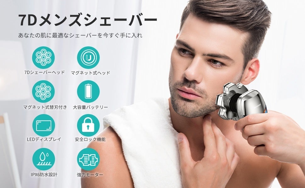 フローティングデザインを採用し、ヘッドが上下・左右に動けます。さらに、7つ柔軟なヘッドを搭載し、アゴ下や頬の凹凸へ均一に圧力がかかりやすく、丸い刃が360°から髭を捕えるため、生えた髭にもしっかりと密着。クセ髭も効率的にシェービングします。肌が弱い、髭が硬いといった人、敏感肌におすすめ。