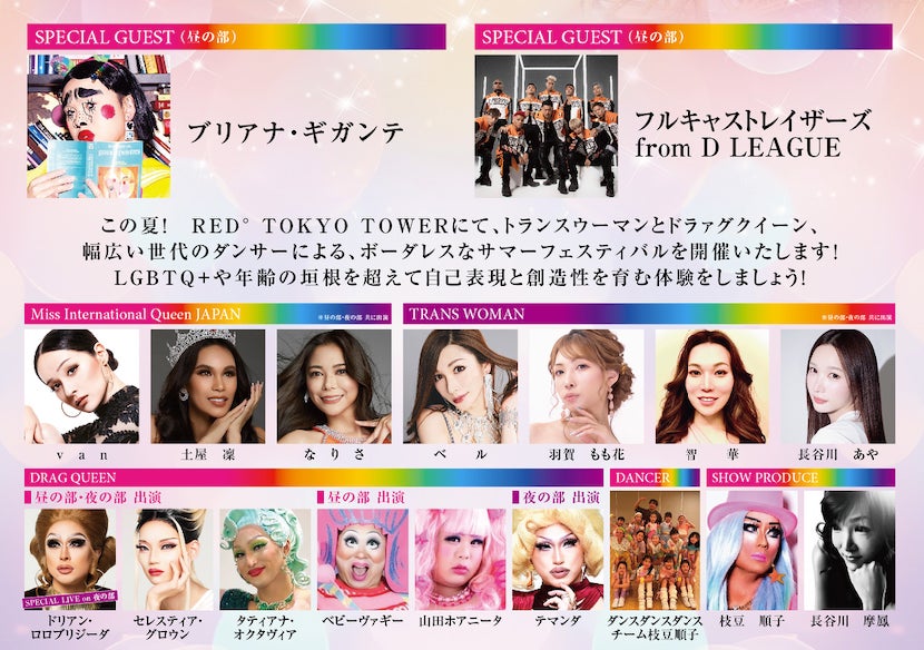 昼の部では、スペシャルゲストとして、様々なメディアで活躍する「ブリアナ・ギガンテ」さんと、プロダンスリーグD LEAGUEから「フルキャストレイザーズ」にご登場いただきます。また、今回初の試みとして、幅広い世代のダンサーを迎え、ドラァグクイーン×キッズダンサーコラボショーなど、新たな芸術表現にも挑戦いたします。