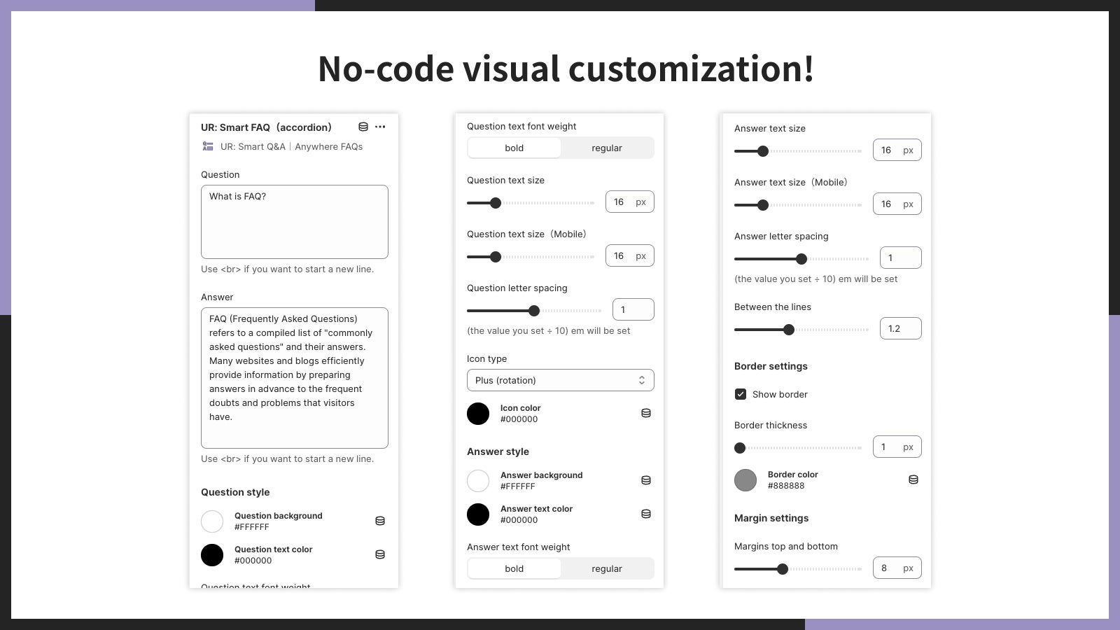 「UR: Smart Q&A|Anywhere FAQs」は、ノーコードで見た目をカスタマイズできます。