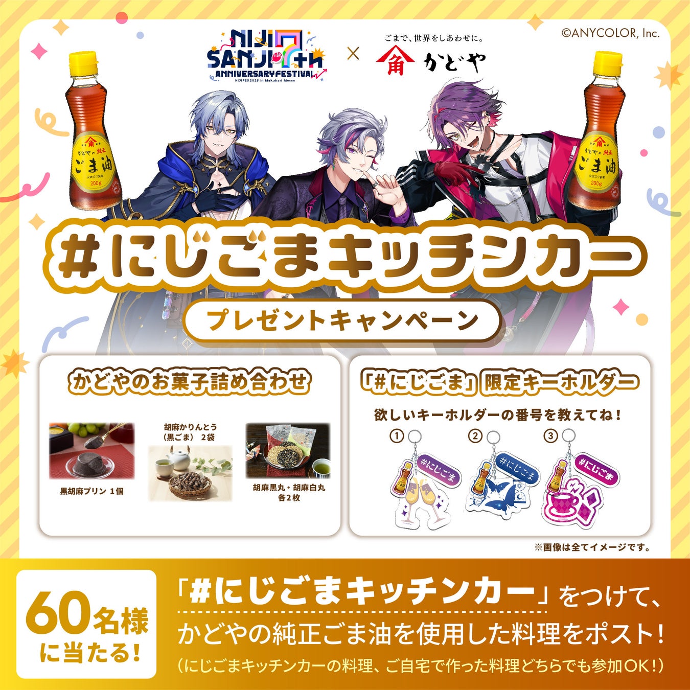かどや製油公式Xにてキャンペーンを実施します。「かどやのお菓子詰め合わせ」と「#にじごま限定キーホルダー」をセットにして抽選で60名様にプレゼント!ぜひ奮ってご応募ください!
